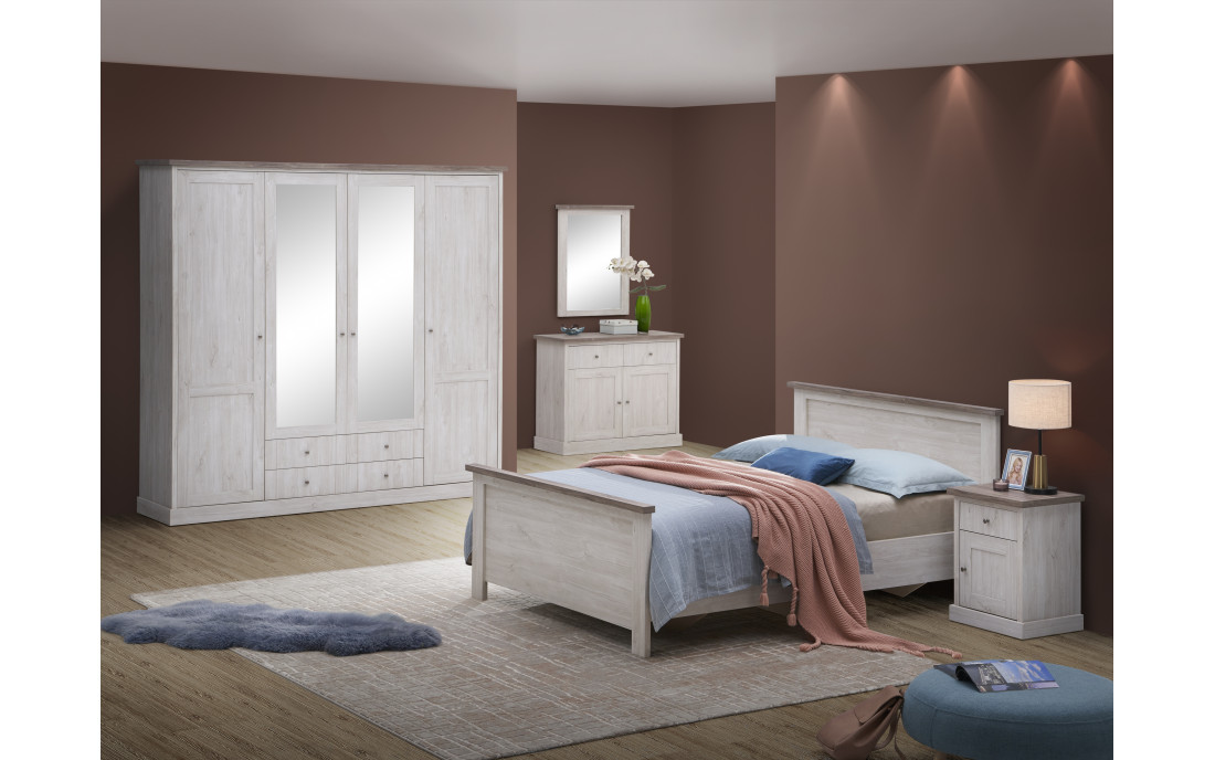 Comprend garde-robes 4 portes battantes 214 cm, lit 140, 2 chevets et commode en option.